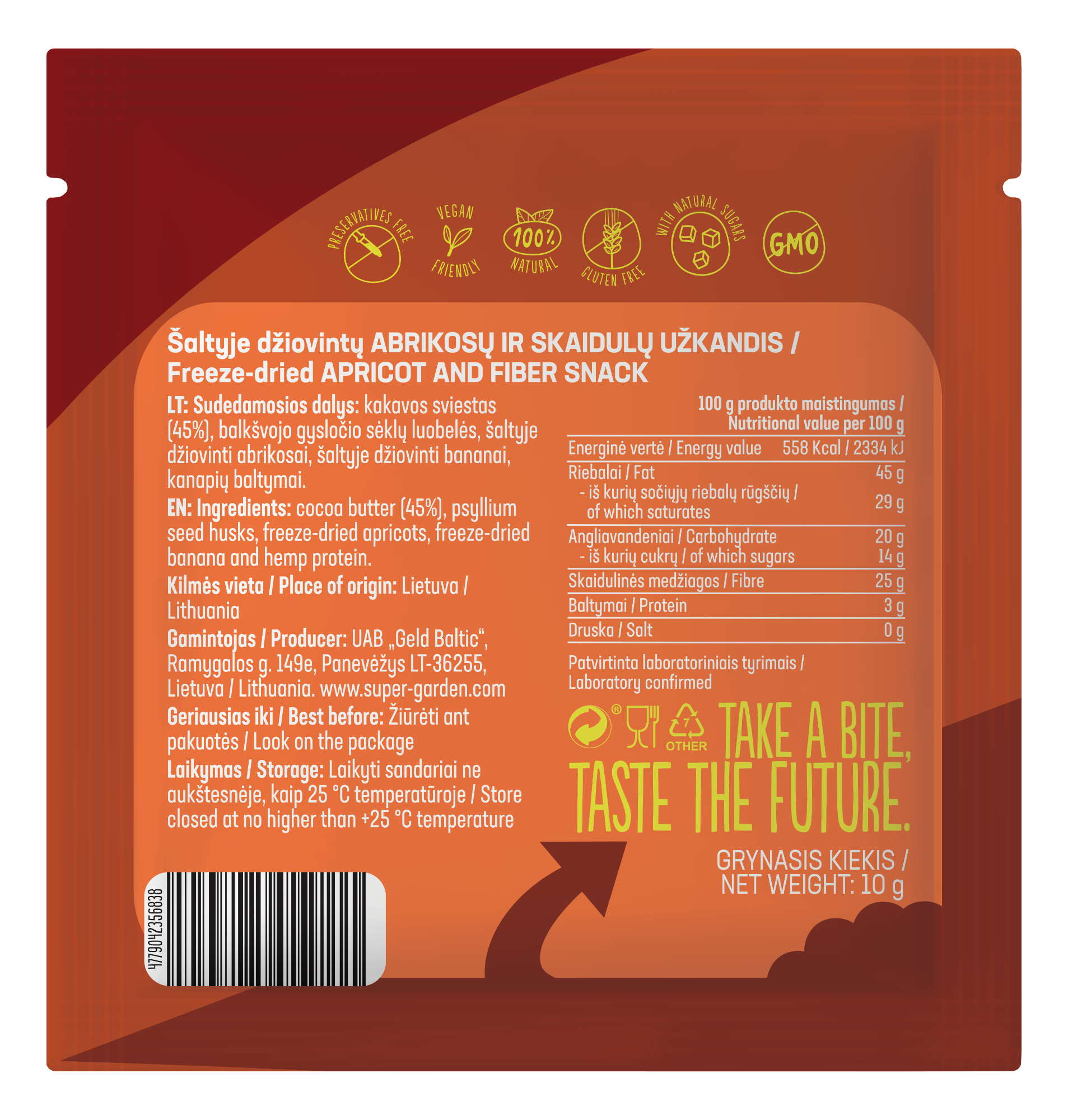 Külmkuivatatud aprikoosi- ja banaanisnäkk KIUDSNÄKK (kakaovõi 45%; jahubanaaniseemnete kestad; külmkuivatatud aprikoosid; külmkuivatatud banaanid; kanepiproteiin)